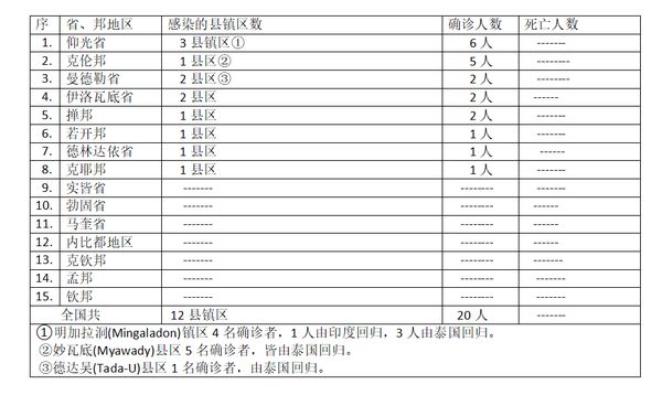缅甸卫生部于11月27日下午4时发布公告,全国各省邦,11月26日的确诊人数20人无死亡人员,具体数据如下表: