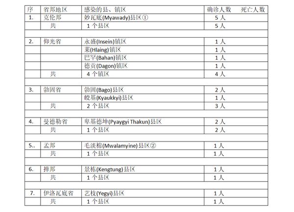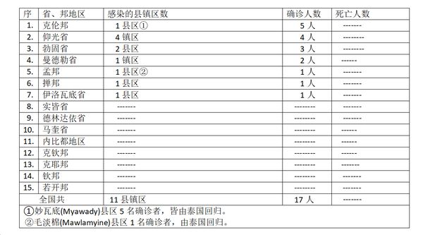 缅甸卫生部于12月7日下午4时发布公告,全国各省邦,12月6日的确诊人数17人无死亡人员,具体数据如下表: