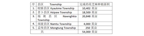 皎脉专区内的各县区目前所完成的花芝麻种植面积如下表:
