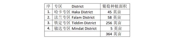 钦邦在2022—23年度种植季节期间,在哈卡(Haka)专区、法兰(Falam)专区、铁定(Tiddim)专区及敏达(Mindat)专区这4个专区内,种植了葡萄364英亩。各专区内种植的葡萄面积如下表: