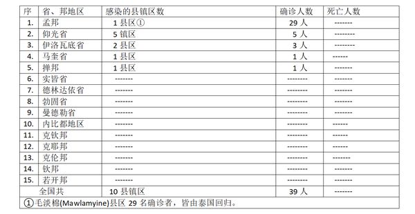 缅甸卫生部于12月12日下午4时发布公告,全国各省邦,12月11日的确诊人数39人无死亡人员,具体数据如下表: