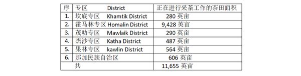 实皆省内的5个专区及那加(Naga)民族自治区属下的各县区种植的茶田中,已有11,000多英亩正在进行采取茶叶的工作了。