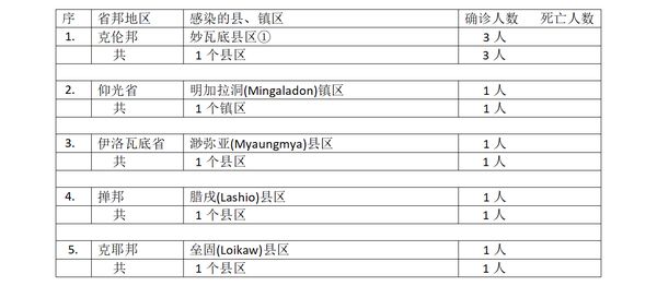 其余仰光省明加拉洞镇区、伊洛瓦底省渺弥亚县区、掸邦腊戌县区及克耶邦垒固县区各有1名确诊者。
