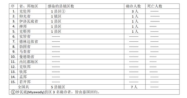 12月20日这一天缅甸全国确诊人数7人,确诊人员来自全国5个省邦地区—克伦邦、仰光省、伊洛瓦底省、掸邦及克耶邦。其余 10个省邦地区为零确诊地区。各省邦地区感染的县镇区及确诊人数如下表: