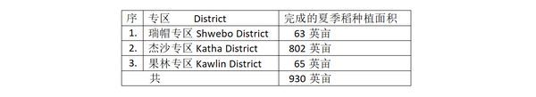 实皆省内,在那加(Naga)民族自治区及13个专区内的各县区中,规划种植夏季稻348,000英亩,目前在3个专区内先期种植了这夏季稻930英亩。