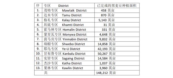 2022—23财政年度冬作物种植季节中,实皆省内的13个专区 已完成了冬作物黑麦豆148,212英亩的种植工作,完成了规划种植面积的90.54%的工作。