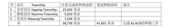 按:实皆省全省今年冬作物种植季节期间规划种植的小麦作物面积为107,650英亩(见《缅华网》2022年11月26日“缅甸新闻”栏目中的“实皆省规划种植10多万英亩小麦作物”这一报导),现在实皆专区就规划种植47,601英亩小麦。占全省规划种植面积的44%,可见该专区是小麦种植的主要地区,期望该专区能如期完成有关种植工作,造福当地民众。