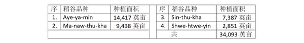 遵纳县区在这雨季稻种植期间,采用的稻谷品种为Aye-ya-min、Ma-naw-thu-kha、Sin-thu-kha及Shwe-htwe-yin等良种稻谷品种,各稻谷品种所种植的面积如下: