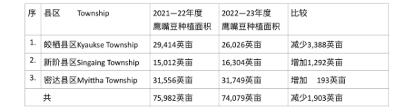 缅华网 伊江树报导据 2月14日出版的《缅甸之光》报报导,曼德勒省皎栖(Kyaukse)专区是种植鹰嘴豆主要的农业区之一,最近两年(2021—22年度及2022—23年度)该专区所属各县区种植的鹰嘴豆面积如下表……