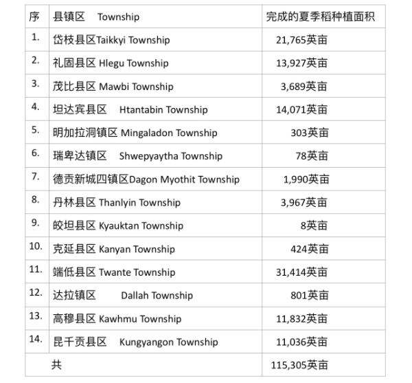 仰光省11个农业县中,除宋割(Thongkwa)县区外,其余县区都广泛种植了这夏季稻。种植面积(除克延、皎坦两县区外),都在3,500英亩以上,甚至有6个县区种植面积到达上万英亩以上,这当中以端低县区完成的种植面积为最多,到达31,000多英亩以上,岱枝县区次之,目前完成的种植面积在21,000多英亩以上。除了这些农业县外,其余有条件的镇区也开展了这夏季稻的种植工作。目前以德贡新城的四个镇区(东、南、北及港口新城镇区)完成的种植面积最多,达到1,990英亩;达拉镇区次之,目前完成种植面积801英亩。各镇区在有条件的地方都广泛种植这夏季稻,为解决仰光大都市民众们的口粮问题尽一份力。
