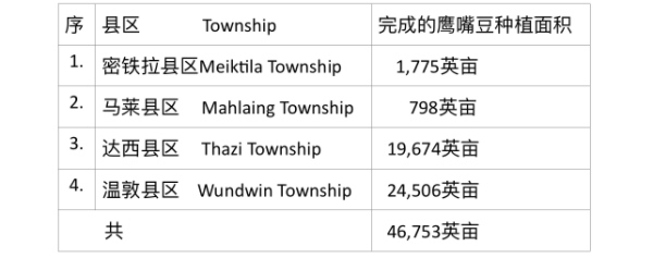 在密铁拉专区农业局的督导指示下,密铁拉、马莱(Ma-hlaing)、达西(Thazi)及温敦(Wundwin)四县区当地的农民们,在种植这鹰嘴豆时,有的采用散播方法种植,有的在犁地后按照株距行距距离来种植。自2022年11月份第1周开始有关种植工作,到目前各县区所完成的耕种面积如下表: