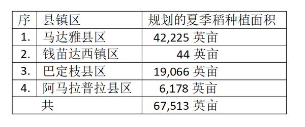 色都基水坝供水区域内的以下四县镇区规划种植的夏季稻面积如下表: