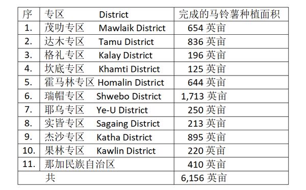 在本财政年度冬作物种植季节期间, 实皆省各专区所完成的马铃薯种植面积如下表: