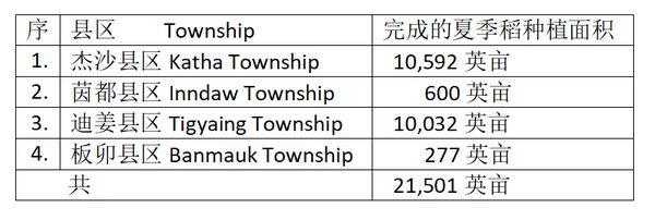 文章导读 实皆省杰沙(Katha)专区属下的各县区已完成了夏季稻21,000多英亩的种植工作,这是由实皆省农业局处获知的讯息。