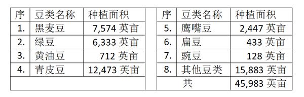 在目前冬作物种植季节中,钦乌县区种植的各种豆类面积如下: