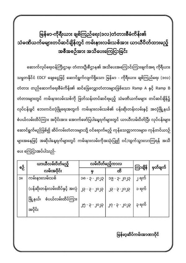 在缅甸-韩国友谊达拉大桥项目的引桥匝道 A 和匝道 B 上安装钢梁期间,为了施工安全将暂时封闭新甘纳路段(Kan nar Rd.)班索丹路(Pansoedan St.)和啊弄镇叁北路口(Sabai St.)