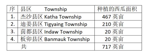 四个县区中,就数杰沙县区及迪姜县区西瓜种植的较多,这可能是由于这两县区都是位于伊洛瓦底江边上,河滩沙洲地较多,故能种植较多的西瓜。