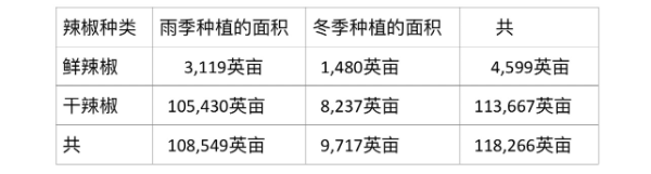 在经济方面划算的这辣椒作物分为鲜辣椒及干辣椒两种,目前的规划,鲜辣椒在雨季时期将种植3,119英亩,冬季时种植1,480英亩。而干辣椒种植方面,雨季时期将种植105,430英亩,冬季时将种植8,237英亩。
