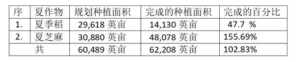 今年夏作物种植季节时,本漂县区方面规划种植的夏作物主要就是夏季稻及夏芝麻。包括利用国家经济促进发展计划所提供的基金赞助种植的农田在内,全县区规划种植夏季稻29,618英亩。自3月份第1周开始有关种植工作,到4月底时完成了这夏季稻14,130英亩的种植工作。