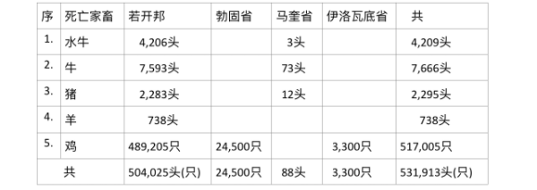 而因此台风的侵袭,若开邦及勃固省、马奎省、伊洛瓦底省等省邦地区死亡的家畜如下: