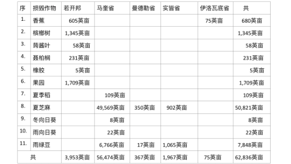 农田遭损毁的省邦中,就数马奎省的农田面积为最多,而不是直接面临台风冲击的若开邦,这大概是因为马奎省广泛种植了有关夏作物之故。而遭损毁的作物中,以夏芝麻的面积为最多,这当中又是马奎省的夏芝麻面积占了绝大多数。伊洛瓦底省并不在台风路线上,所以遭损毁的农田也就是75英亩香蕉果园而已。