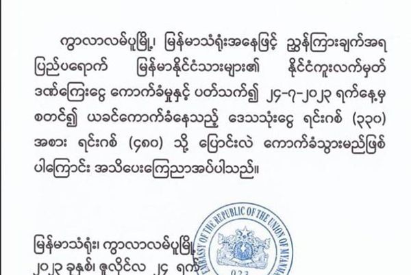 缅甸驻吉隆坡大使馆在声明中表示,根据指示,自2023年7月24日起,对在国外的缅甸公民护照征收罚款的费用由330林吉特改为480林吉特。
