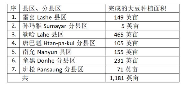 目前那加民族自治区内各县区分县区所完成的大豆种植面积如下表: