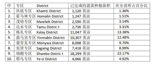 目前实皆全省各专区完成的8万多英亩蔬菜种植面积中,以瑞帽专区种植面积为最多,该专区目前完成的种植面积占全省的22% 以上。完成种植面积第二多的是格礼专区,第三为茵马宾专区,这两专区各自完成的种植面积几乎都是全省的八分之一。这3个专区完成的种植面积都在1万英亩以上,而其他专区完成的种植面积就都在9千英亩以下了。