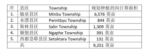 “今年敏巫专区规划在敏巫县区、本漂(Pwintbyu)县区、斯林(Salin)县区、额别(Ngaphe)县区及西都岱耶(Setoktara)县区这5个县区共种植9,251英亩向日葵,直到目前为止只种植了这雨向日葵3,506英亩,采收时每英亩产量为8.29缅箩。”专区农业局负责人U Hla Moe这样介绍道。专区内各县区原规划种植的雨向日葵面积如下表: