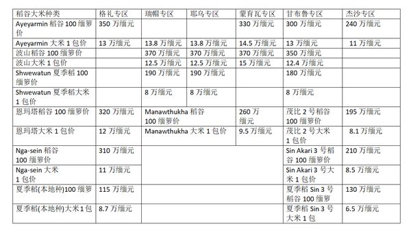 (稻谷价为100缅箩价,而大米价为1包价。在缅甸,大米1包容量为1.5缅箩,约合30缅斤,按公斤算约为50公斤。