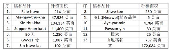 种植的稻谷品种中,以Sin-thu-kha为最多,其次是Ma-naw-thu-kha,这两种稻谷品种也是在全缅甸有名的稻谷品种。