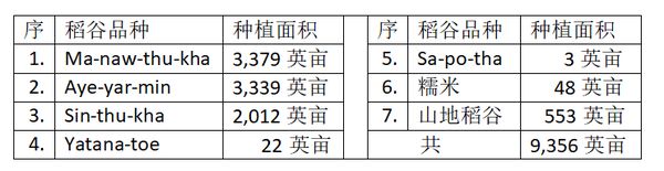 今年额别县区种植的雨季稻稻谷品种有Ma-naw-thu-kha、Aye-yar-min、Sin-thu-kha、Yatana-toe、Sa-po-tha、糯米及山地稻谷品种。各种稻谷品种所种植的面积如下表: