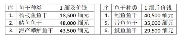 壁榜县区输送往仰光出售的鱼干有鰆鱼鱼干、鳐鱼鱼干、(海鱼)攀鲈鱼干、杨枝鱼鱼干、带鱼鱼干、鱵鱼鱼干等。目前各种鱼干1缅斤的价钱分别为: