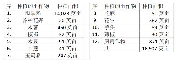 额佑高分县区今年雨季规划种植各种雨作物16,507英亩,自今年6月份第1周开始有关种植工作,到目前已百分之百地完成了所有的种植工作。种植的雨作物这以雨季稻为最多,其余作物包括木薯、玉蜀黍、花生、厨房作物等。完成的各种雨作物种植面积如下表: