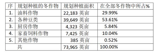 规划种植的冬作物中,以豆类种植面积为最多,占了全部冬作物种植面积的一半以上,其次是油料作物,种植面积约为全部冬作物种植面积的3成。