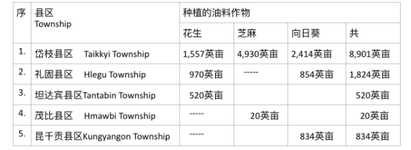 各种油料作物中,花生的主要种植县区为岱枝(Taikkyi)、礼固(Hlegu)及坦达宾(Tantabin)县区;芝麻的主要种植县区为岱枝县区及茂比(Hmawbi)县区;向日葵的主要种植县区为岱枝县区、礼固县区及昆千贡(Kungyangon)县区。各县区规划种植的油料作物如下表: