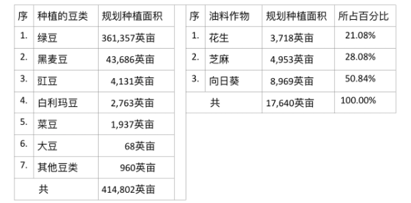仰光省规划种植的各种豆类包括绿豆、黑麦豆、豇豆、菜豆、白利玛豆、大豆及其他豆类,油料作物则规划种植花生、芝麻及向日葵等。各种作物规划种植的面积如下表: