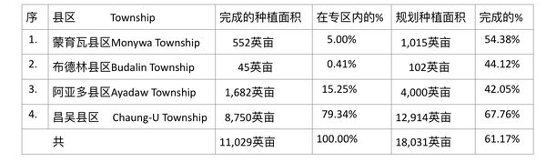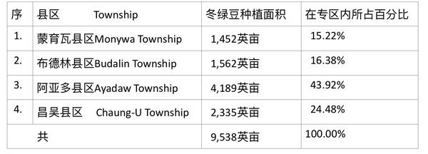 在过去的冬作物种植季节期间,蒙育瓦专区也曾规划种植这绿豆作物9,621英亩,自2023年10月至12月期间共种植了这冬绿豆9,538英亩,各县区所种植的这冬绿豆作物面积如下: