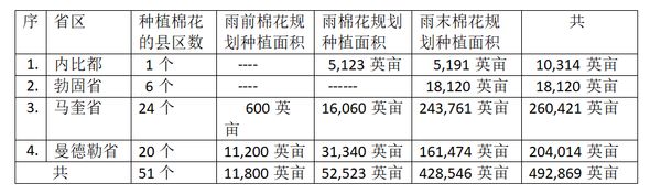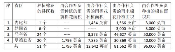 在这四个省区规划种植的49万多英亩的棉花中,规划将有96,000英亩的棉花将由合作社负责种植工作,组织农民们成立棉花种植生产合作社,各省区组织合作社种植的棉花面积如下表: