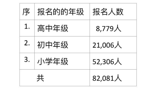首都内比都方面,第一天来报名的学生人数有82,091人,高中、初中及小学人数分别如下表: