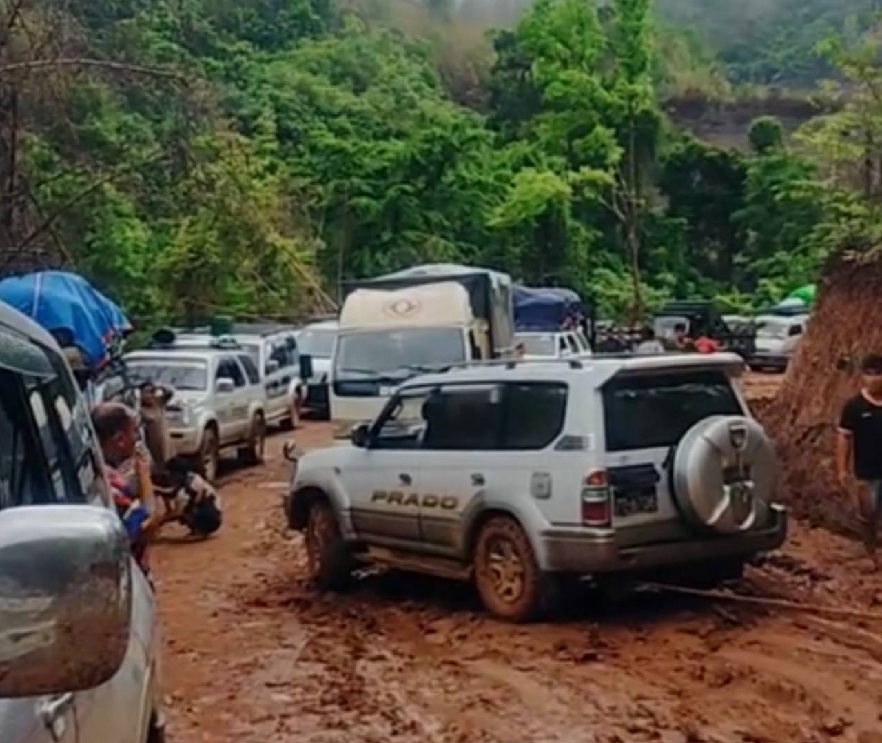 孟丽路段是土路,由于下雨,汽车因泥泞而无法行驶,交通堵塞情况从6月10日开始,直到今天早上仍有被困车辆。