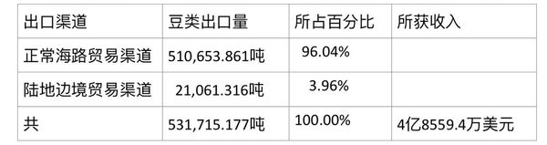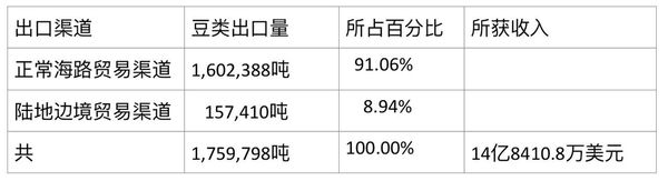 在这财政年度中由海路出口的豆类占了九成以上的的比例,由边贸出口的豆类所占比例不到一成。而出口175.9万多吨的豆类,获得14.84亿多美元的收入,平均每吨豆类获得843.34美元的价钱。