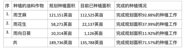 三种油料作物中,以芝麻种植面积为最多,花生次之。而目前完成的种植工作中,也是芝麻完成的种植面积为最多。