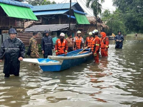 连日来,妙瓦底市连续暴雨,道茵河水位已上涨至危险水位以上,妙瓦底市的第一、第二、第五街区在内的低洼处街区被水淹没,救援组织正在疏散居民。