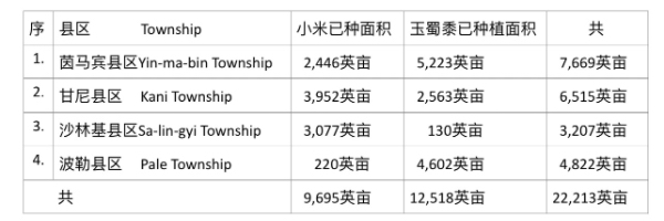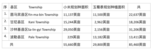 在现在2024—25财政年度雨作物种植季节期间,茵马宾专区内的各县区规划种植的的小米及玉蜀黍的面积如下表:
