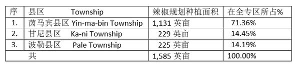 茵马宾专区的4个县区中,沙林基(Salingyi)县区完全没规划种植这冬辣椒。茵马宾县区规划种植的冬辣椒则占了全专区种植面积的七成以上。