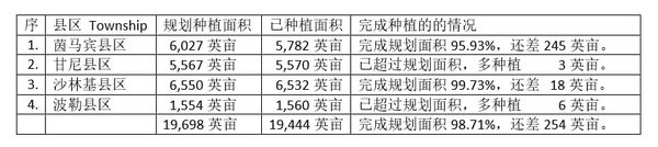 四个县区中,不论是规划种植面积,还是已完成的种植面积,都以沙林基县区为最多,而茵马宾县区为次之。