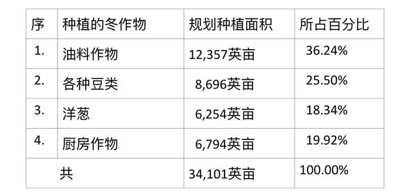 规划种植的各种冬作物中,以油料作物规划种植面积为最多,占全部冬作物种植面积的三分之一以上;豆类规划种植面积次之,占全部冬作物规划种植面积的 ¼ 以上的比例。