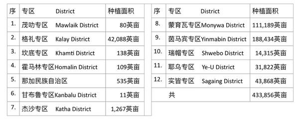 今年雨季实皆省各专区内种植的雨芝麻面积如下表: