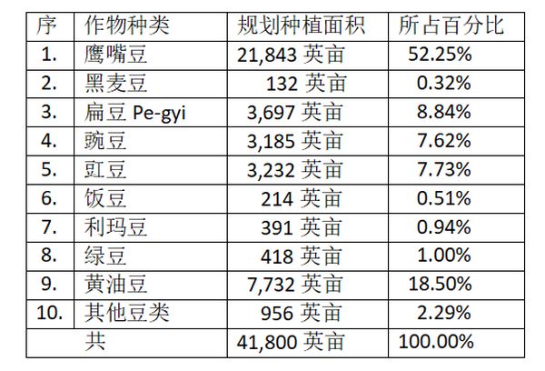 在现在的冬作物种植季节期间本漂县区规划种植的各种豆类面积如下: